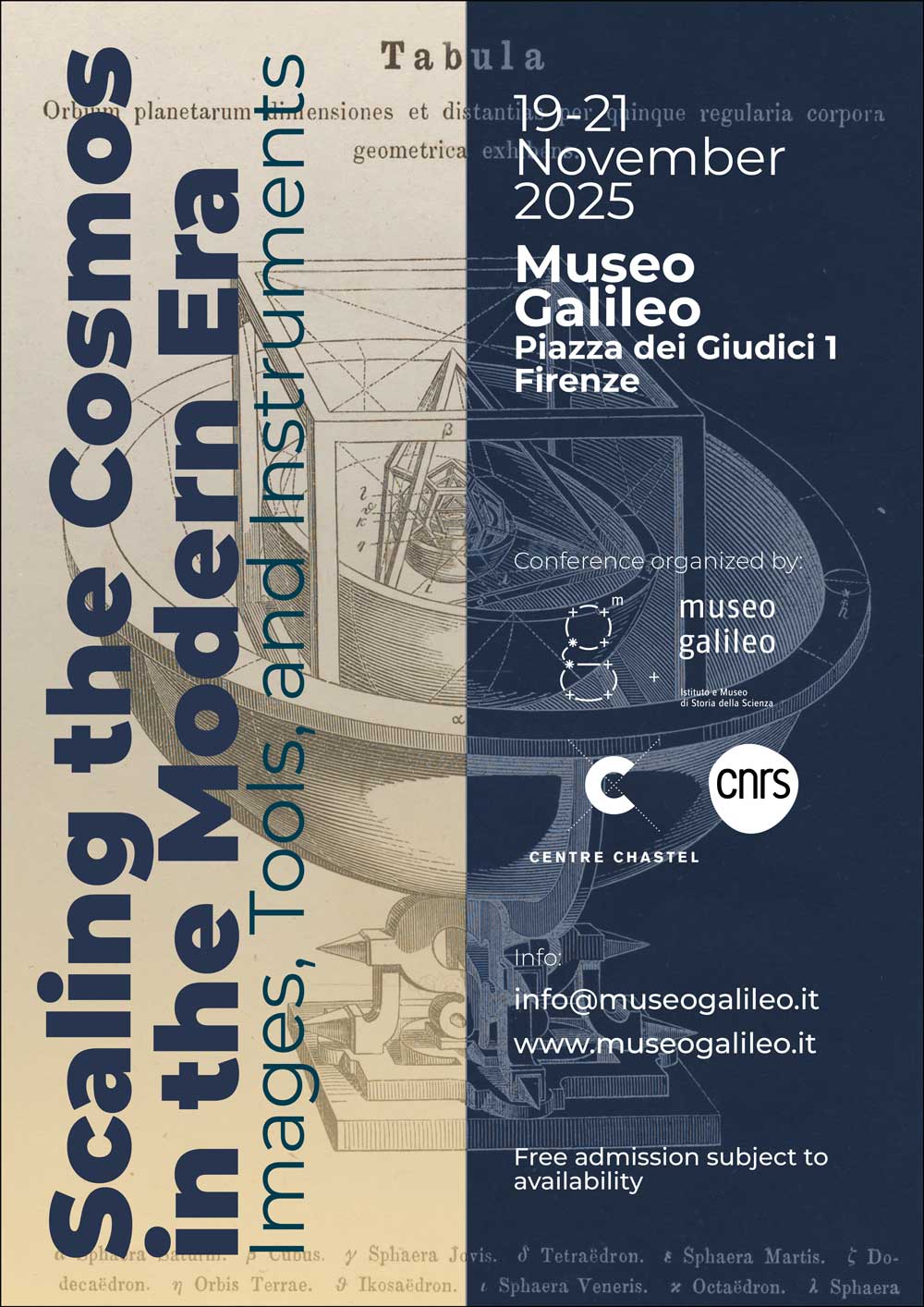 Il convegno è frutto della collaborazione tra il CNRS/Centre André-Chastel e il Museo Galileo. È parte del progetto di ricerca “Celestial Spectacles” (CNRS/Centre André-Chastel), finanziato dalla Chair Professor Junior ARVIGRAPH del CNRS e si avvale del sostegno scientifico del PEPR “Origins” (CNRS), dedicato a indagare le origini dei pianeti e della vita. L’iniziativa si colloca all’interno delle celebrazioni per il centenario dell’Istituto di Storia della Scienza (fondato nel 1925) e prende spunto dalle recenti esposizioni Ore italiane (2023) e Splendori celesti (2023-2024), ideate e organizzate dal Museo Galileo. Il convegno, inoltre, commemora il 400° anniversario della nascita di Giovanni Domenico Cassini.